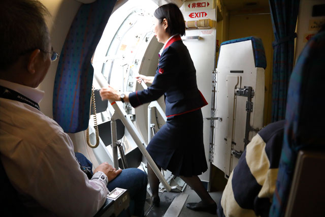 サーブ340Bの客室乗務員用シートに座り機内アナウンスを体験するツアー参加者=19年11月30日 PHOTO: Masahiro SATO/Aviation Wire