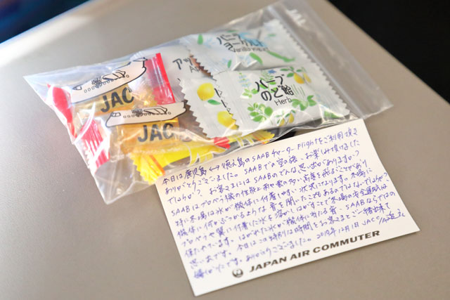 JACのサーブ340B退役チャーターの機内で配られた直筆メッセージ入りのあめ=19年12月1日 PHOTO: Masahiro SATO/Aviation Wire