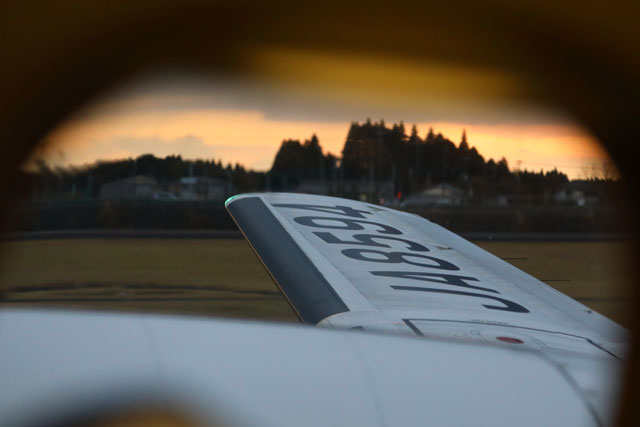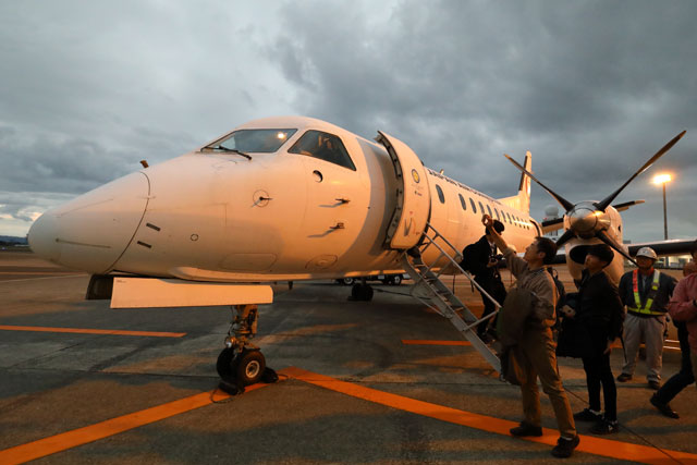 鹿児島の出発が2時間近く遅れてスタートした空の旅も、最終的に30分以下の遅れに縮まっていた。着陸では日没間近の夕日に照らされ、北側からの進入となるランウェイ16に降り立ち、出発時と同じ15番スポットに到着した。連絡バスがターミナルの到着口に着いても、参加者は別れを惜しむかのように、遠くに見えるサーブを、カメラやスマートフォンで収めていた。