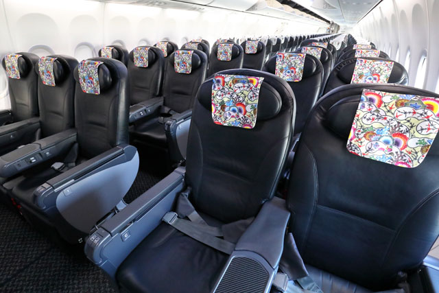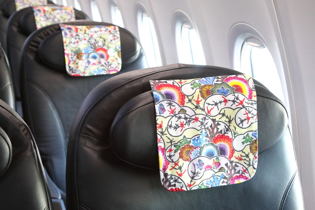 JTAの737-800のクラスJシートで採用する琉球紅型のヘッドレストカバー=19年12月16日 PHOTO: Masahiro SATO/Aviation Wire