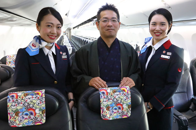 琉球紅型のヘッドレストカバーを紹介するJTAの客室乗務員=19年12月16日 PHOTO: Masahiro SATO/Aviation Wire