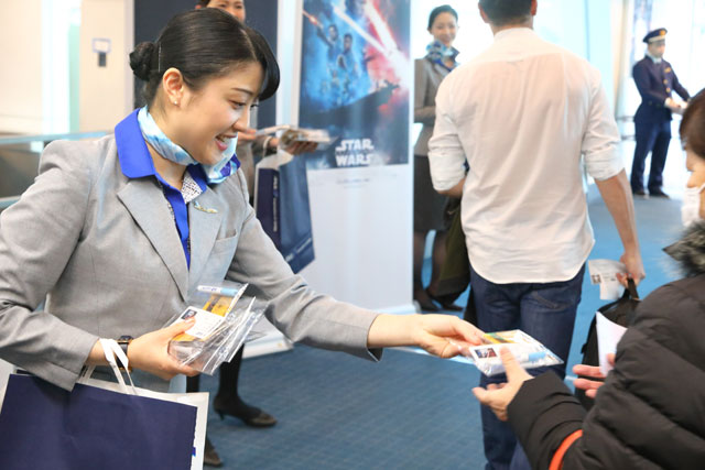 羽田空港で開かれたスター・ウォーズイベントで乗客に記念品を配るANAの地上係員=19年12月20日 PHOTO: Masahiro SATO/Aviation Wire