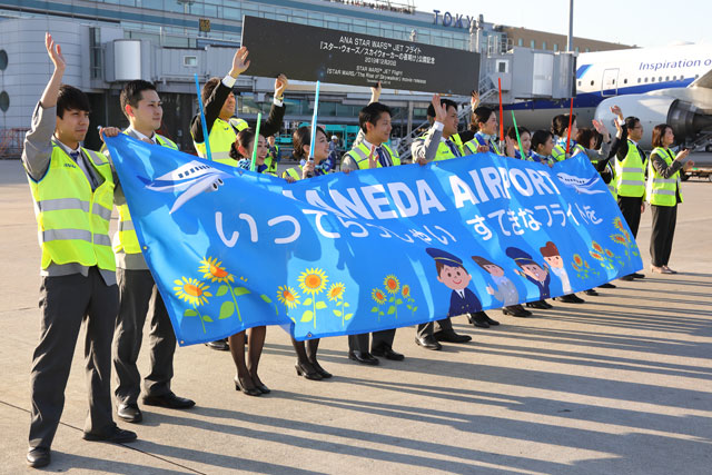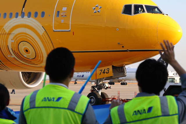 ・ANA、C-3POジェット就航 黄色いエプロンでCA出迎え(17年3月21日)