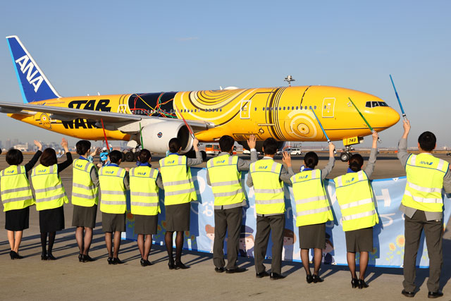 全日本空輸(ANA/NH)は12月20日、映画『スター・ウォーズ』の最新作公開に合わせたイベントを、羽田空港の国際線と国内線の両ターミナルで開いた。同社の国内線が乗り入れる第2ターミナルでは、人気キャラクター「C-3PO」を描いた黄色の特別塗装機「C-3PO ANA JET」(ボーイング777-200ER型機、登録番号JA743A)による那覇行きNH475便の乗客に記念品がプレゼントされた。