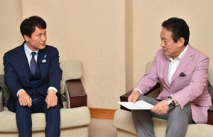 要望書を提出後に会談する鹿児島県の三反園知事(左)とピーチの井上CEO=19年12月26日 PHOTO: Yusuke KOHASE/Aviation Wire