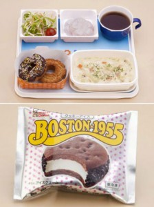 2種類のドーナツとボストンクラムチャウダーをセットにした「AIR MISDO」(上)と「クッキーアイス BOSTON 1955」(JALの資料から)