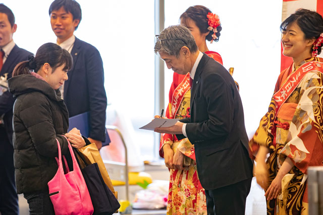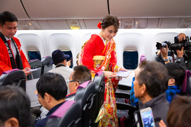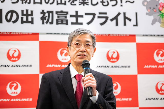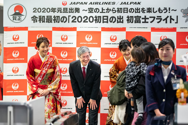 出発に先立ち、あいさつした赤坂社長は、今夏に開催される東京オリンピック・パラリンピックについて、「3月には聖火輸送、4月には制服を一新する。日本へ来ていただく準備をしっかりしたい」と述べた。「今年の客室乗務員は全員子年。歴代制服を着用して何人か乗務する」とあいさつした。整備出身の赤坂社長は、「整備士なのでしっかり地上でサポートしたい」と、今年も搭乗はしなかった。
