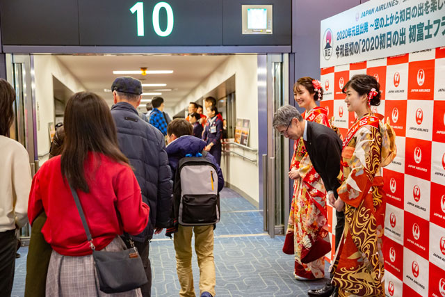 乗客にはおせち風弁当と紅白まんじゅう、升酒が配られた。初日の出の鑑賞後は、機内で抽選会が開かれた。