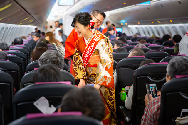 機材はボーイング767-300ER型機の国内線仕様機「JALスカイネクスト」(登録記号JA613J、3クラス252席)を使用。搭乗口前では、JALの赤坂祐二社長や、着物姿で同乗する2019年度「ミス日本グランプリ」の度會(わたらい)亜衣子さんと「ミス日本水の天使/ミス着物」谷桃子さんとの記念撮影コーナーに、乗客たちが列を作っていた。また、聖火トーチの撮影コーナーも設けられた。