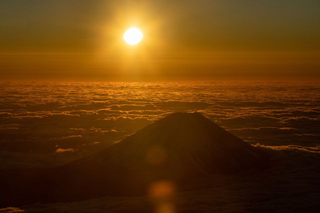 太陽が富士山の奥から徐々に顔を出すと、乗客はスマートフォンなどで御来光を写真に収めていた。