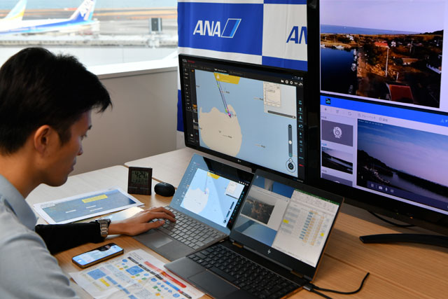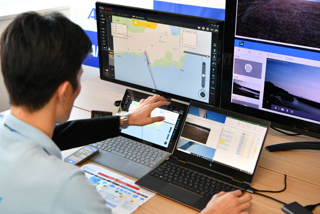 今回実験に使用しているACSLのドローンは、羽田のセンターにいるフライトディレクター(運航管理者)がノートパソコンから遠隔操作で運航開始の指示をドローンに送ると、その後はプログラムされた通りに、高度60メートルの高さで海上を飛行していた。
