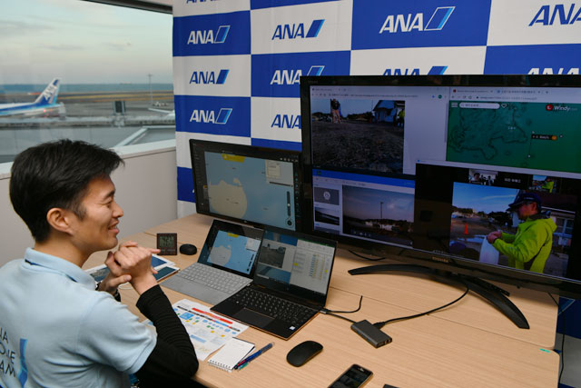 羽田空港で黄島に進入するドローンを遠隔操作するANAHDのフライトディレクター=20年1月10日 PHOTO: Tadayuki YOSHIKAWA/Aviation Wire