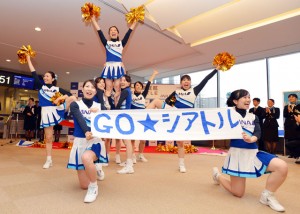 12年度は北米が好調だったANA。シアトル線の就航セレモニーでパフォーマンスを披露するANA社員のチアリーディングチーム=12年7月 PHOTO: Tadayuki YOSHIKAWA/Aviation Wire