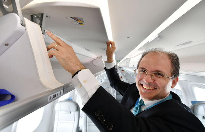 E195-E2のオーバーヘッドビンをアピールするエンブラエルのフェルナンド・アリーノ・グラウ氏=20年2月11日 PHOTO: Tadayuki YOSHIKAWA/Aviation Wire