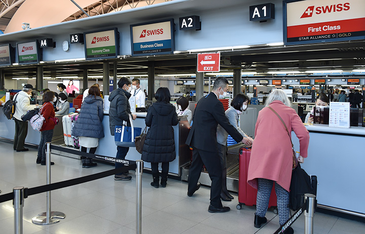 関空で搭乗手続きするスイス インターナショナル エアラインズのチューリッヒ行きLX159便の利用客=20年3月2日 PHOTO: Yusuke KOHASE/Aviation Wire