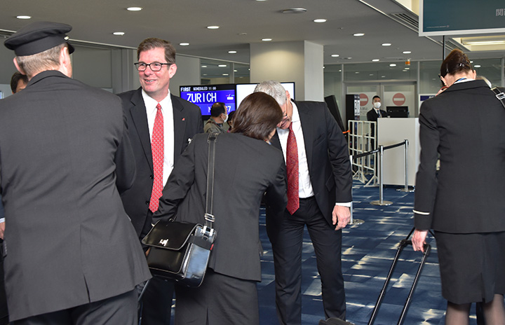 関空でチューリッヒ行きLX159便初便の乗務員を激励するスイス インターナショナル エアラインズのドナルド・ブンケンブルク日本支社長(左から2人目)=20年3月2日 PHOTO: Yusuke KOHASE/Aviation Wire