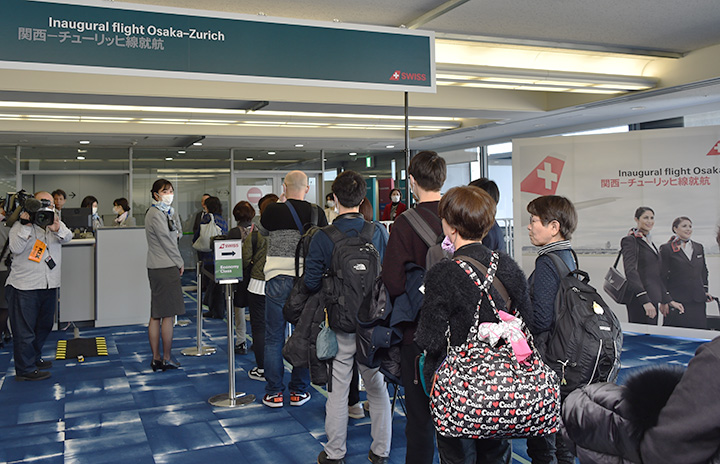 関空でスイス インターナショナル エアラインズのチューリッヒ行きLX159便初便に搭乗する乗客=20年3月2日 PHOTO: Yusuke KOHASE/Aviation Wire