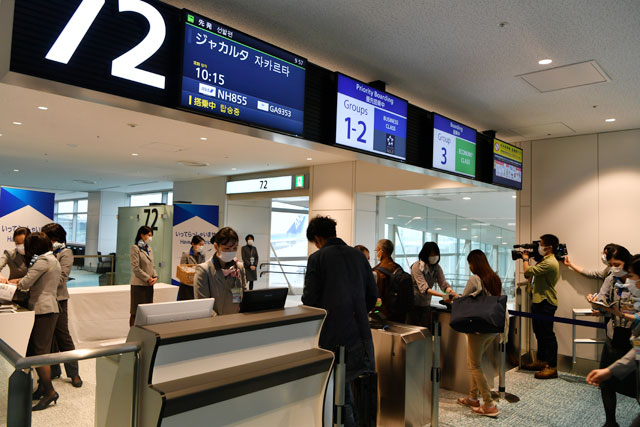 羽田空港第2ターミナル国際線施設の72番搭乗口から搭乗するジャカルタ行きNH855便の乗客=20年3月29日 PHOTO: Tadayuki YOSHIKAWA/Aviation Wire