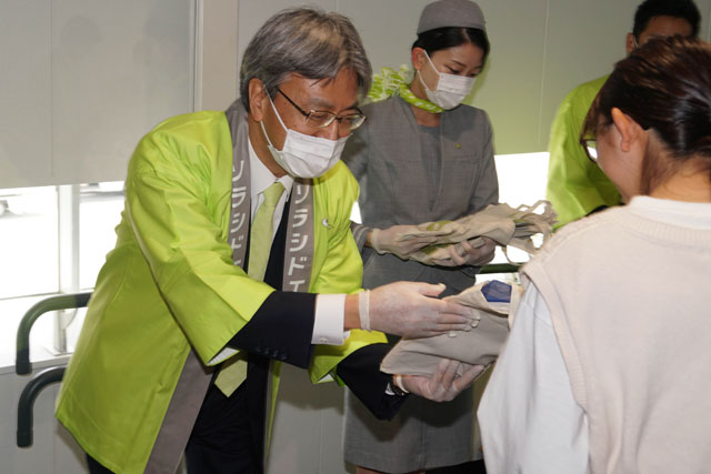 感謝を表す横断幕を掲げるソラシドエアの髙橋社長(中央)と社員=20年3月29日 PHOTO: Masahiro TSUKAHARA/Aviation Wire