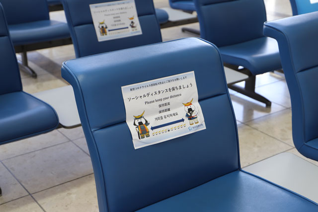 空港内の各所には消毒液が設置され、イスは間隔をあけて座るよう案内がなされている。チェックインカウンターや保安検査場、搭乗口前などの床には、足跡のステッカーや停止線が貼られ、ソーシャル・ディスタンシング(対人距離)の確保につながる取り組みが目に付く。また、チェックインカウンターや案内所には飛沫感染防止のビニールカーテンやアクリル板が設置され、保安検査場の入口には検温用のサーモグラフィーが設けられている。空港や航空会社の係員による清掃や消毒も頻度を高めて清潔さを保っている。