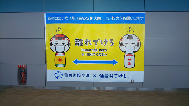 仙台空港でソーシャルディスタンシング確保を呼びかける「仙台弁こけし」を起用したポスター(仙台空港会社提供)