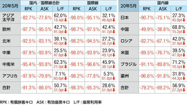 IATA(国際航空運送協会)の2020年5月の世界旅客輸送実績は、国際線と国内線の合計で、有償旅客の輸送距離を示すRPK(有償旅客キロ)は前年同月比91.3%減、座席供給量を示すASK(有効座席キロ)は86.0%減となった。ロードファクター(座席利用率、L/F)は31.0ポイント低下の50.7%で、中国から拡散した新型コロナウイルスにより、各国で大きく落ち込んだ。