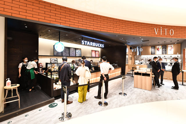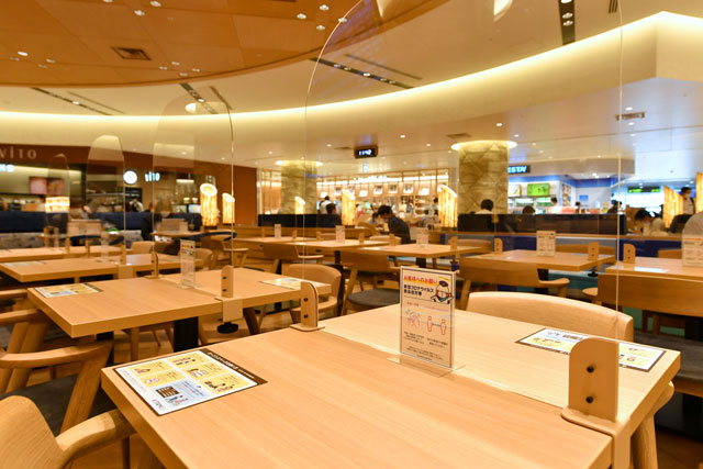 飲食エリアのテーブルには、対面する席と席の間に透明なアクリル板が設けられ、新型コロナウイルス対策も盛り込まれてのグランドオープンとなった。
