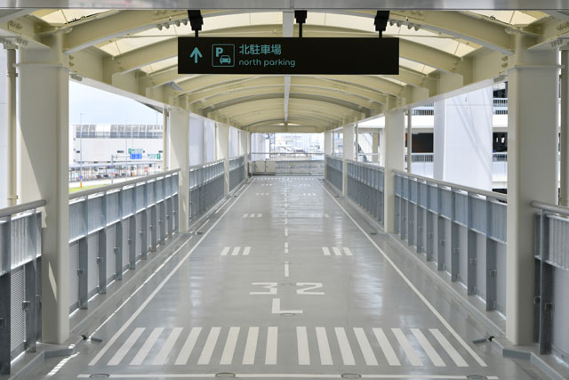 伊丹空港のモノレール駅から新築された北立体駐車場へ向かうアクセスデッキは滑走路をイメージ=20年8月5日 PHOTO: Tadayuki YOSHIKAWA/Aviation Wire