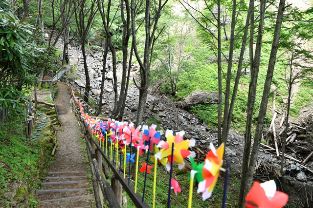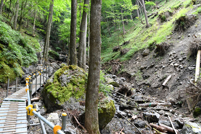 御巣鷹山の登山道は、昨年10月の台風19号の影響で一部が崩れ、仮設の足場が所々に設けられていた。