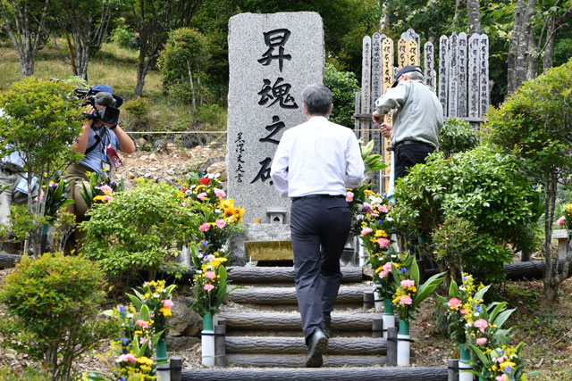 御巣鷹山の「昇魂之碑」に献花し祈りを捧げるJALの赤坂社長=20年8月12日 PHOTO: Tadayuki YOSHIKAWA/Aviation Wire