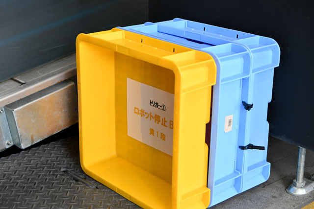 ロボットの画像認識は形状を認識するだけで、色は識別していないという。一方、作業に携わる係員が一目でわかるよう、自動積み込み停止のコンテナボックスは黄色、再開を指示するものは青色にした。