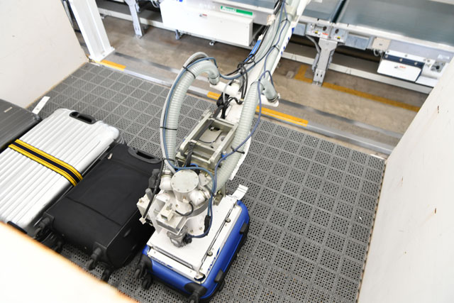 乗客がチェックインカウンターで預けた手荷物は、手荷物仕分場に設置した「暗室」と呼ぶ黒い囲いの中で自動積み込みを行う手荷物なのかを判別。フレームで囲った天井に取り付けた吸着式ロボットがキャリーバッグを吸い上げ、バルクカートに積み込む。搭載位置は天井のカメラで識別し、積み込んでいく。