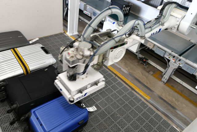 ロボットが吸着できる重量は最大30キロで、積み込みにかかる時間は1個あたり人の手だと30秒、ロボットだと26秒と短縮できるが、現時点では時間短縮よりも省力化や作業工程の自動化を進めること主眼に置いているという。佐賀から羽田へ向かう便の場合、貨物室に積み込む手荷物は平均25個程度となっている。