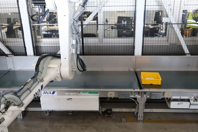 黄色いコンテナボックスを流すと自動積み込みを停止するANAが佐賀空港で運用している自動手荷物積み込みロボット=20年10月5日 PHOTO: Tadayuki YOSHIKAWA/Aviation Wire