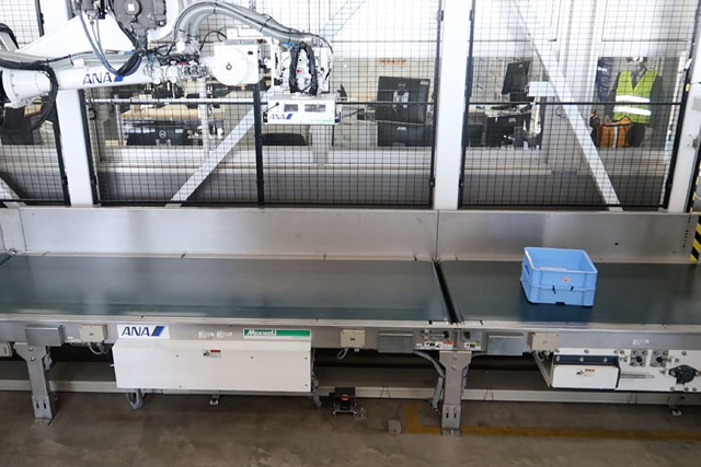 青色のコンテナボックスを流すと自動積み込みを再開するANAが佐賀空港で運用している自動手荷物積み込みロボット=20年10月5日 PHOTO: Tadayuki YOSHIKAWA/Aviation Wire