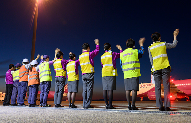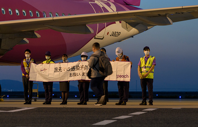 関空を出発するピーチの国際線再開初便となった台北行きMM27便を見送るスタッフら=20年10月25日 PHOTO: Daigo TAKENOBU/Aviation Wire