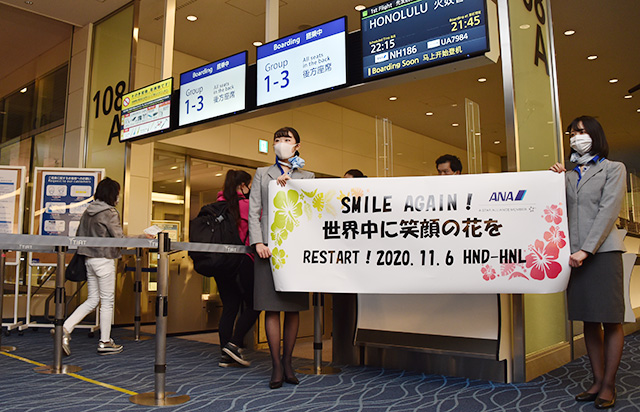 羽田-ホノルル線は10月5日に再開した成田線同様、ハワイへの赴任や留学、在住者の一時帰国向けに運航する。羽田からの再開初便となったホノルル行きNH186便(ボーイング787-9型機、登録記号JA890A)は64人(うち幼児0人)が搭乗。日本人と外国人が半々の割合で、帰国者やホノルルで乗り継いで米国本土へ向かうとみられる利用客が目立った。同便は羽田空港第3ターミナル108A番搭乗口を午後10時7分に出発。ホノルル到着は6日午前10時15分を予定している。