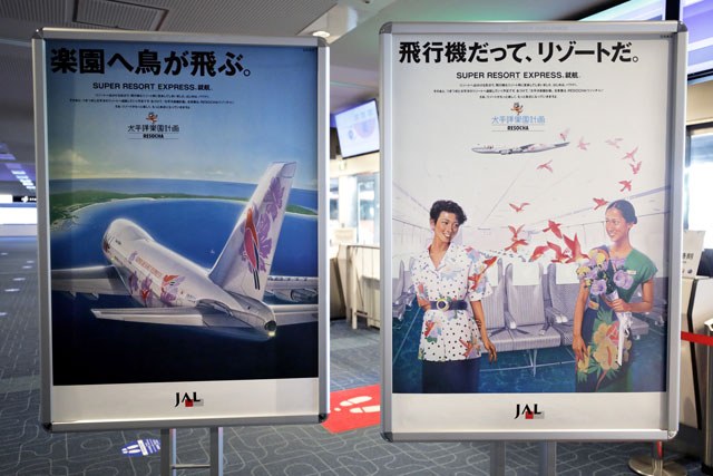 便名は「良いハワイ」にちなみJL1801便。羽田空港の搭乗口付近には、ハワイ路線に投入していた歴代特別塗装機のモデルプレーンや、当時のポスターなどが展示された。