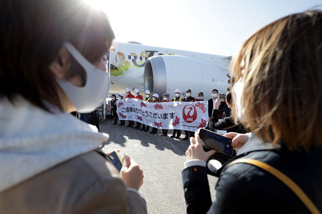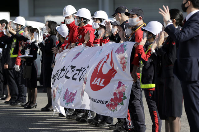 羽田空港を出発する「ハワイ気分周遊フライト」JL1801便を見送るJALのスタッフ=20年11月14日 PHOTO: Kiyoshi OTA/Aviation Wire