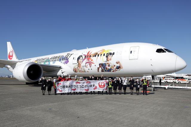 日本航空(JAL/JL、9201)は11月14日、ハワイ気分を機内で体験できる遊覧飛行「ハワイ気分周遊フライト」を羽田発着のチャーター便で実施した。1990年代に機内で開催していた「リゾッチャ」ビンゴを復活させ、客室乗務員も当時の制服を着用。およそ3時間のフライトで、ハワイ路線の機内食も提供された。機材は男性アイドルグループ「嵐」のメンバーを描いた特別塗装機「ARASHI HAWAII JET」(ボーイング787-9型機、登録記号JA873J)が投入された。