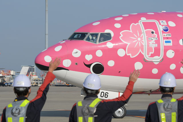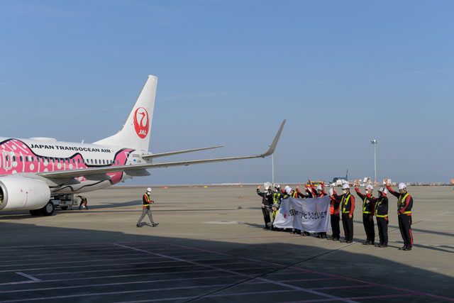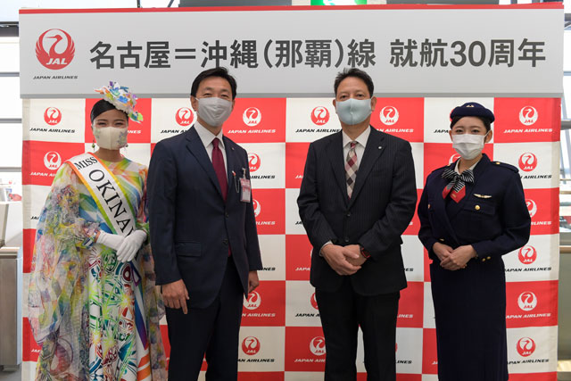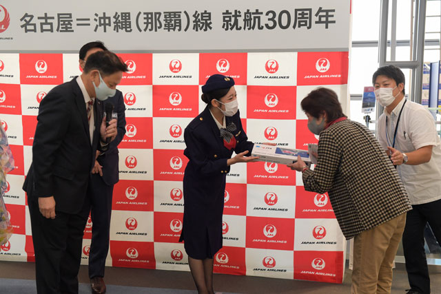 日本航空(JAL/JL、9201)は11月16日、名古屋-那覇線就航30周年記念式典を中部空港(セントレア)で開いた。日本トランスオーシャン航空(JTA/NU)の特別塗装機「さくらジンベエ」(ボーイング737-800型機、登録記号JA06RK)による中部発那覇行きNU045便の乗客には、記念品が手渡された。