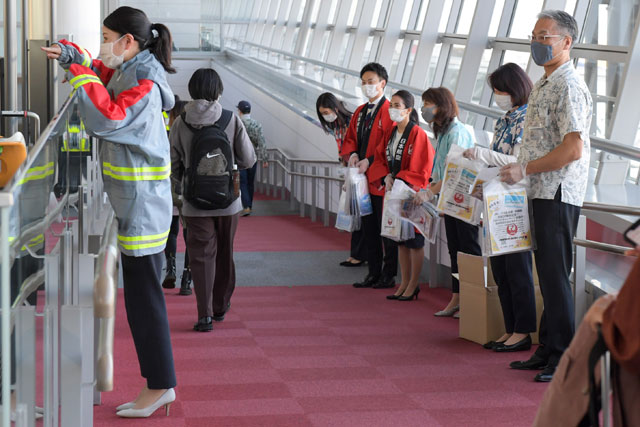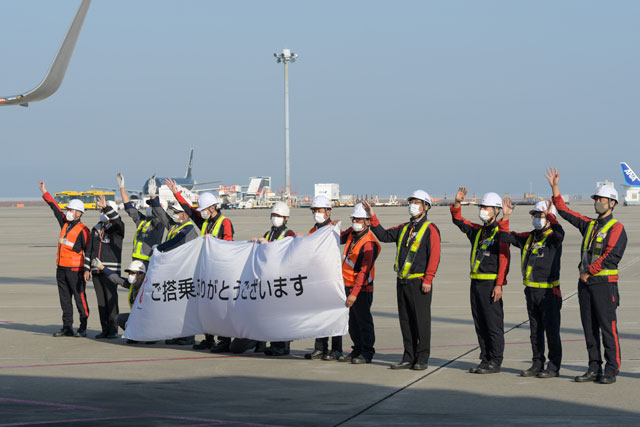 名古屋-那覇線就航30周年を記念し中部空港で那覇行きNU045便を見送るJALグループ社員=20年11月16日 PHOTO: Takayuki MURATA/Aviation Wire
