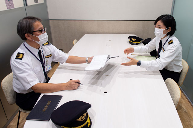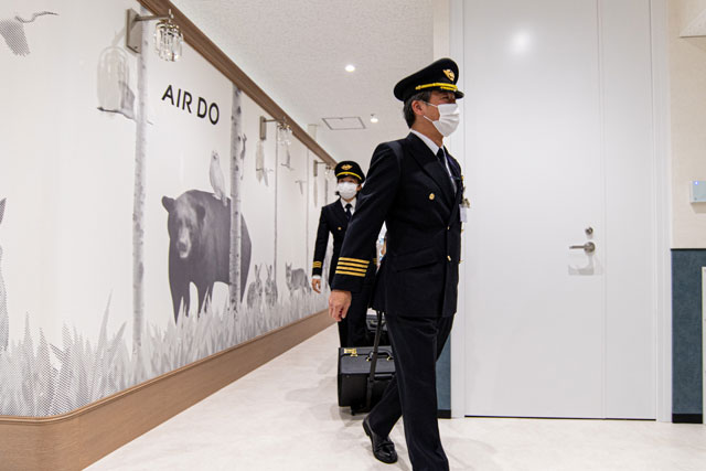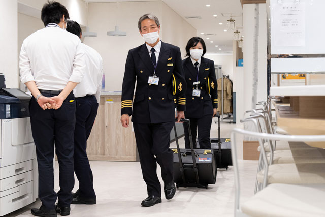 副操縦士に昇格し佐野機長とともに羽田空港内のオフィスから初フライトに向かう星さん=20年11月18日 PHOTO: Takayuki MURATA/Aviation Wire
