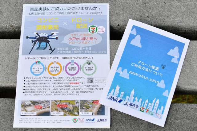今回の実証実験は12月2日から5日まで実施。島民が日用品などを注文すると、対岸のJR姪浜駅周辺のセブンイレブンの店舗、福岡小戸4丁目店から博多湾沿いの福岡市ヨットハーバーまで電気自動車で陸送し、ANAHDの社員がドローンに積み込んで能古島まで2.3キロを4分程度で飛行している。注文から能古島に品物が届くまでは約30分で、初日の2日は12往復24便を運航した。