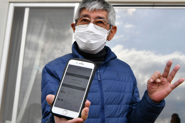 能古島からスマートフォンでセブンイレブンに食料品を注文した自治会長の福田さん=20年12月3日 PHOTO: Tadayuki YOSHIKAWA/Aviation Wire