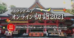 ソラシドエア(SNJ/6J)は、オンライン初詣イベントを2021年1月5日まで開催している。同社は新型コロナウイルス感染症(COVID-19)の影響で、2021年の初日の出・初詣フライトの実施を見送るが、これまで初詣に訪れていた宮崎の青島神社の協力を得て「遥拝証(ようはいしょう)」を共同制作し、同社のウェブサイトでダウンロードできるようにした。また、新年の願い事を投稿するコーナーを設けた。