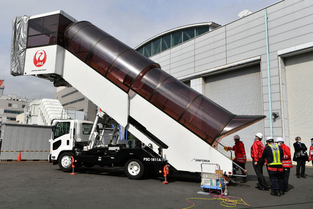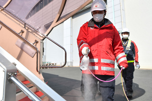 日本航空(JAL/JL、9201)グループでグラハン業務を担うJALグランドサービス(JGS)は3月9日、羽田空港で使うすべてのステップ車に抗ウイルス・抗菌コーティング作業を実施した。新型コロナウイルス感染症(COVID-19)に対する不安がある中、乗客に安心して利用してもらうため、手すりなどにコーティング剤を噴霧した。