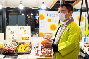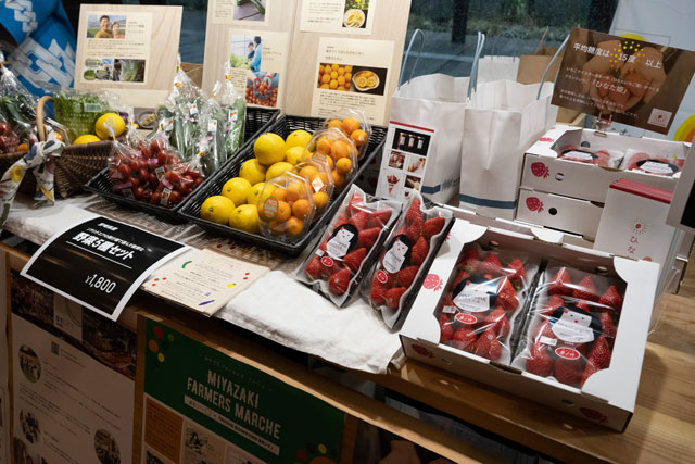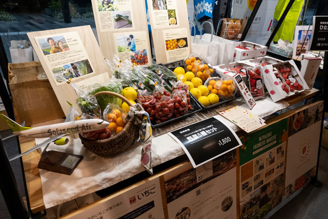 ホテルエントランスの特設会場では、ズッキーニやミニトマトなどの「野菜&果物セット」、宮崎県産いちご「ひなた姫」が販売された。これら特産品は前日に3月13-14日分として空輸されたもので、重量で約140キロを用意したという。また、20-21日、27-28日も同量の販売を予定している。