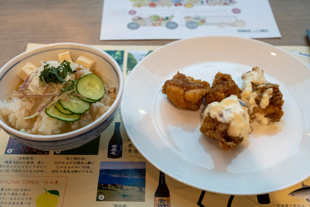 宮崎フェアのランチブッフェで提供された宮崎の郷土料理冷や汁(左)とチキン南蛮=21年3月13日 PHOTO: Takayuki MURATA/Aviation Wire