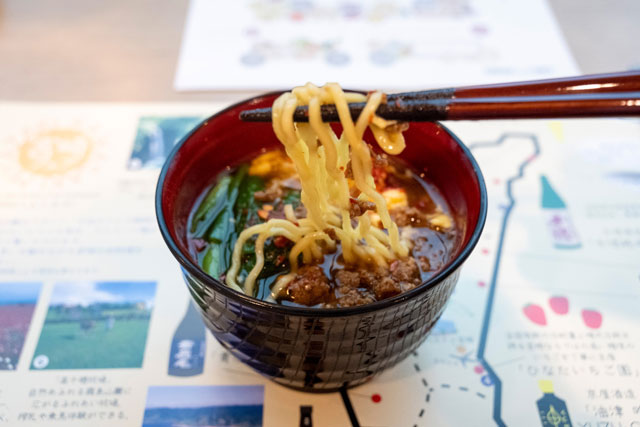 宮崎フェアのランチブッフェで提供された宮崎のB級グルメ「辛麺」=21年3月13日 PHOTO: Takayuki MURATA/Aviation Wire